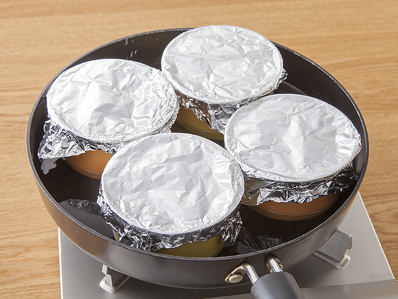 フライパンに耐熱容器の高さ1/3くらいの湯を沸かし、いったん火を止めて(3)を並べ、沸騰したら弱火にし、フタをして約14~16分蒸します。容器をゆらして、中央が少し柔らかいくらいが、蒸し上がりの目安です。画像はまだ蒸し上がっていません!!