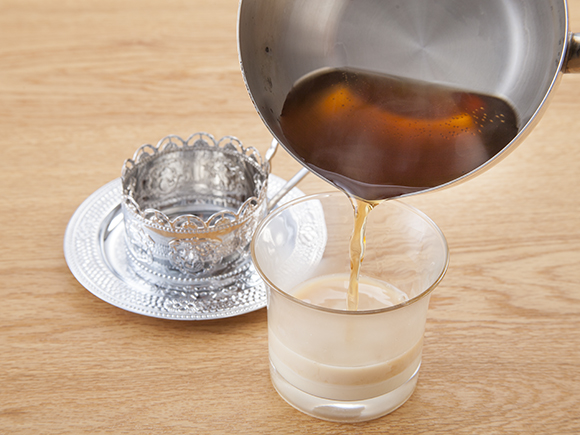 コンデンスミルクと紅茶が2層に分かれるよう、ゆっくり注いでください。火を使うときは、やけどをしないように注意してくださいね!