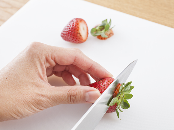 お手伝いに挑戦!いちごのヘタを包丁で切ってみよう!!包丁を使うときは手を切らないよう、気をつけて~!