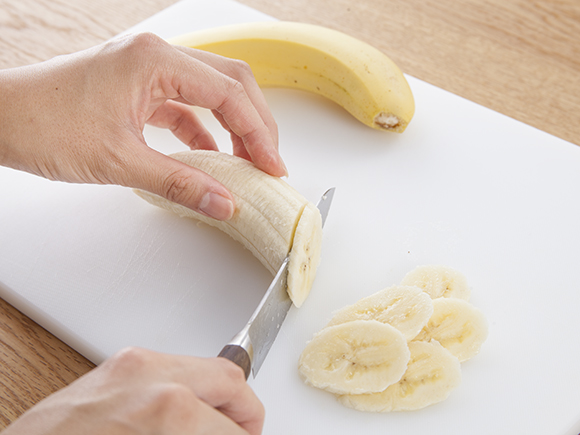 はじめてのお手伝いだったら、バナナの皮をむいてみてね!お兄ちゃん、お姉ちゃんになったら、包丁でバナナの薄切りに挑戦してね!!包丁を使うときは手を切らないよう、気をつけて~!