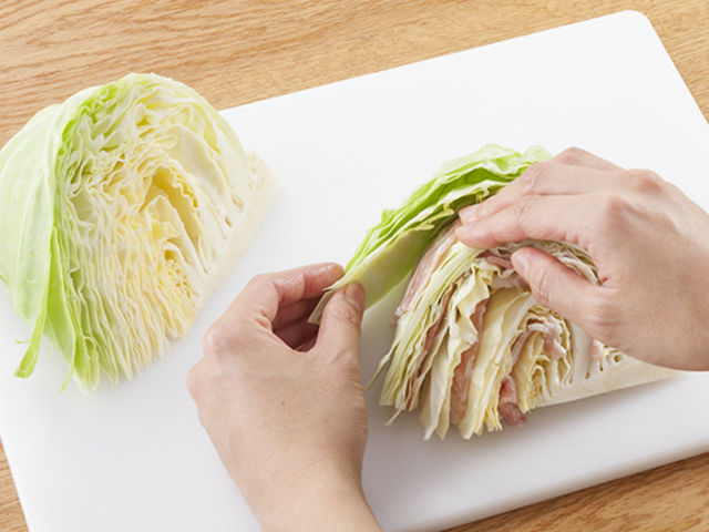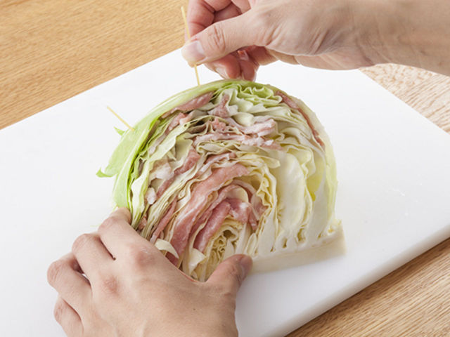 キャベツに豚肉をはさんだあとに、スパゲッティや楊枝などで留めると、形よく仕上がります。スパゲッティは一緒に食べることができますよ~★火を使うときは、やけどをしないように注意してくださいね!
