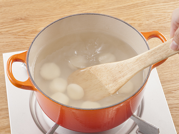 白玉を鍋に入れたら、鍋につかないように木べらなどでかき混ぜてください。火を使うときは、やけどをしないように注意してくださいね!