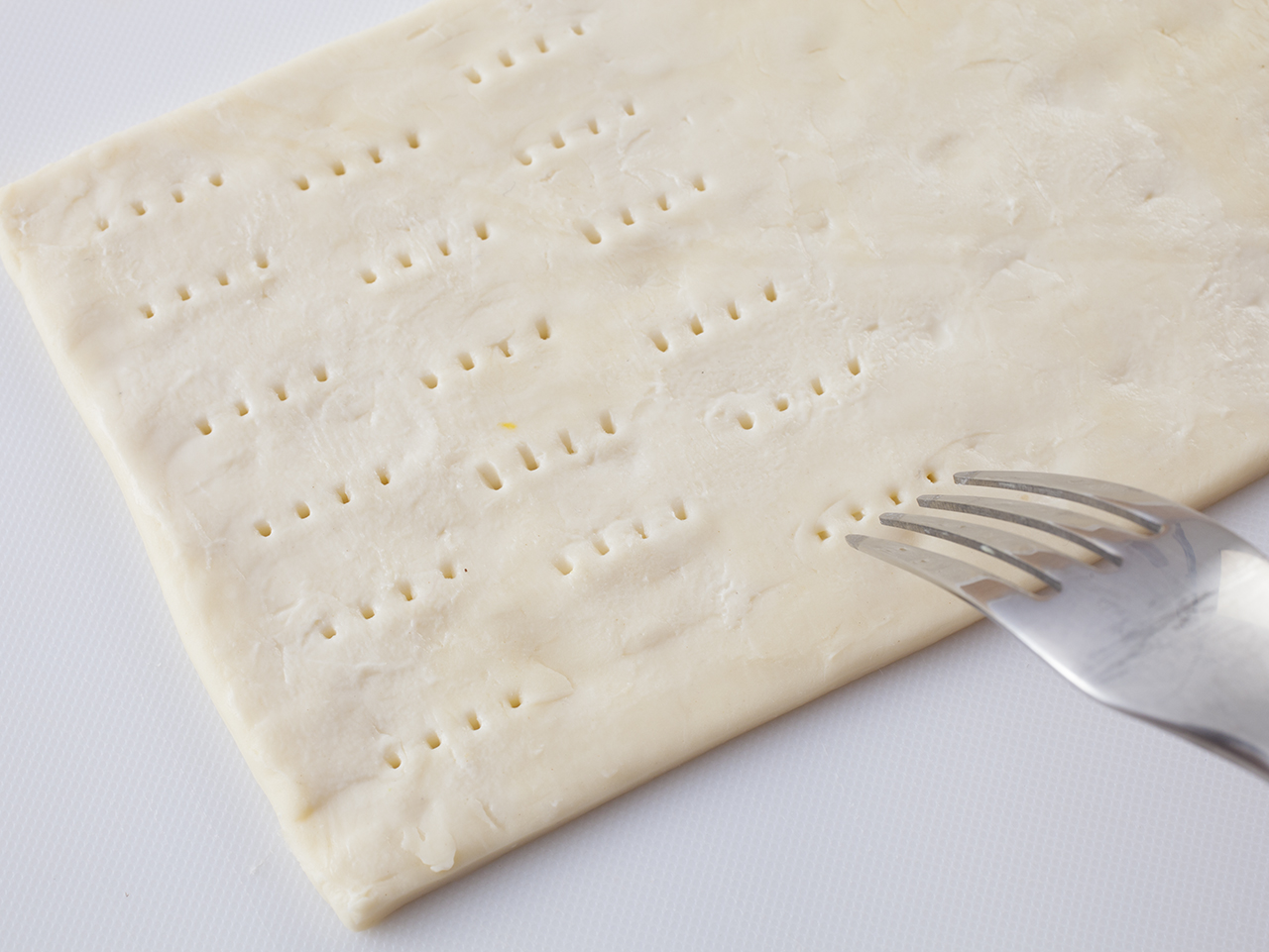 穴があいていない冷凍パイシートをつかう場合には、切り分けて包丁で切り込みを入れる前にフォークなどで穴をあけておいてください。やけどをしないように注意してくださいね!包丁を使うときは手を切らないよう、気をつけて~!※冷凍パイシートは18×11cmのものを使用しています。