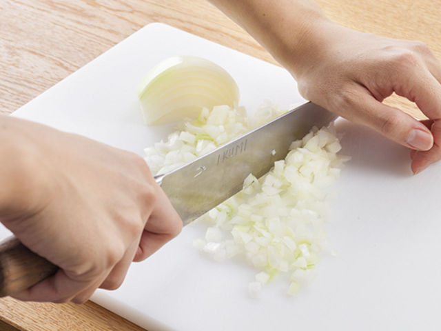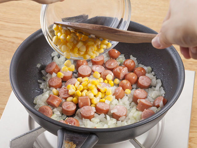 フライパンにオリーブオイルを熱し、ソーセージ、玉ねぎの順に炒めます。玉ねぎがしんなりとしたら、コーンを加えて軽く炒めます。粗みじんとは粗いみじん切りにすること。みじん切りとは、材料を細かく切る、細かく刻む切り方です。大きさは、「ごくみじん」は1~2mm角、「みじん」は2~3mm角、「粗みじん」は3~4mm角のことを指します。玉ねぎを切ると目にしみますが、冷蔵庫で冷やしてから切ると、しみにくくなります。火を使うときは、やけどをしないように注意してくださいね!