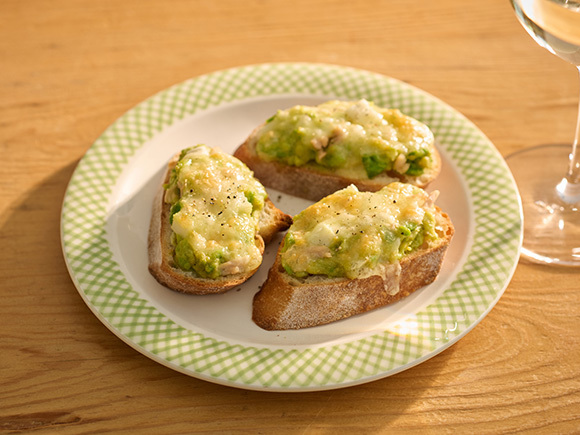 長芋の食感も楽しめるボリューム満点のバゲットトースト。アルコールの吸収を穏やかにしてくれる脂質を多く含むチーズやアボカドはおつまみにおすすめ!