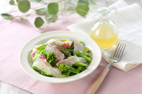 生茶ドレッシングは、少しアクの苦みを感じる春野菜に合わせて、はちみつのコクのある甘みを加えた、甘みとうまみの生茶ドレッシングに。生茶の茶葉の香りがほんのり香ります。淡白なお魚、鯛にも、コクのある甘みの生茶ドレッシングが良く合います。
