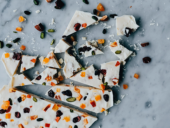 スプーンを使って一口大の円形にチョコレートを流して材料を乗せるマンディアンが一般的ですが、大きな型に流し入れてお好みの形に切ったり割ったりしてもかわいく仕上がります。切り分けるときは少し常温に戻すと綺麗に切ることができます。