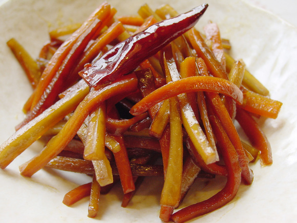 ごぼうは、浸した水が茶色になったら、アク抜きOKです。辛いのが苦手な方は、鷹の爪を小口切りにせずに種を取って、そのまま入れましょう。普段捨ててしまいがちな、大根の皮の部分をごぼうの代わりに使うと、一風変わった大根きんぴらになります。