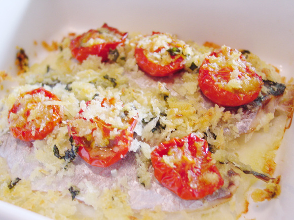 香草パン粉は冷凍すると日持ちするので、作り置きができます。香りと歯触りをよくするために、本レシピでは生パン粉と生バジルを使いました。ミニトマトがない場合は、普通のトマトでも代用できます。
