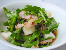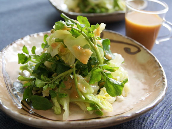 甘いキャベツとほろ苦いクレソンの組み合わせ。しょうが風味の味噌ドレッシングで。