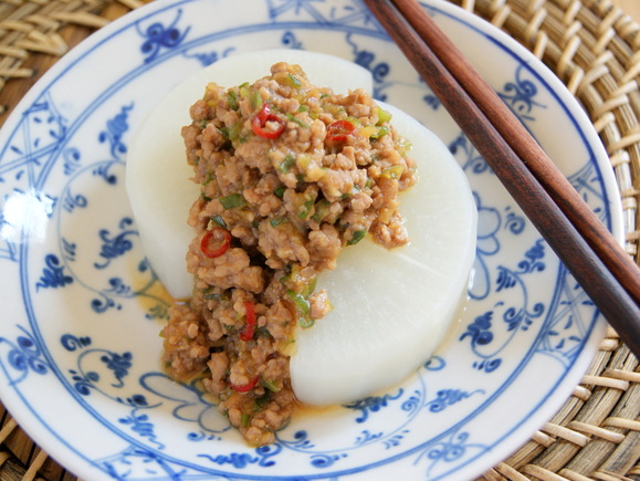 ほっこりとゆでた大根をピリ辛の肉味噌と一緒に。