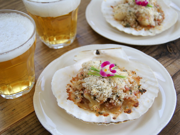 ベーコン等と合わせたほたてにバジルパン粉をふって焼きます。