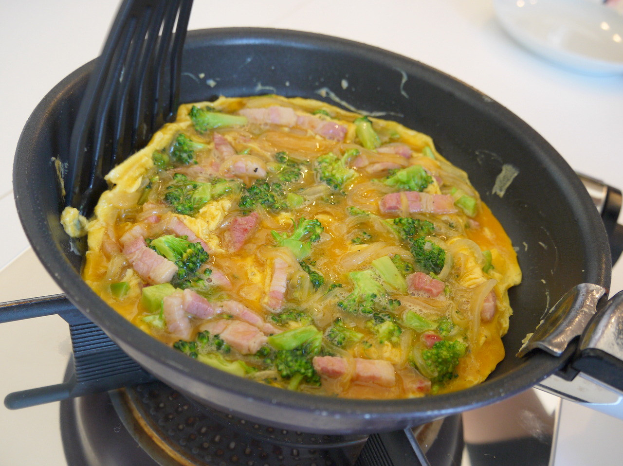 ブロッコリー、パンチェッタ、じゃがいもなど、具だくさんでボリュームたっぷりのスペイン風オムレツ。オムレツを成形するのが難しそうに感じますが、やってみると案外簡単。直径20cm前後の小さめのフライパンを使うのがポイントです。