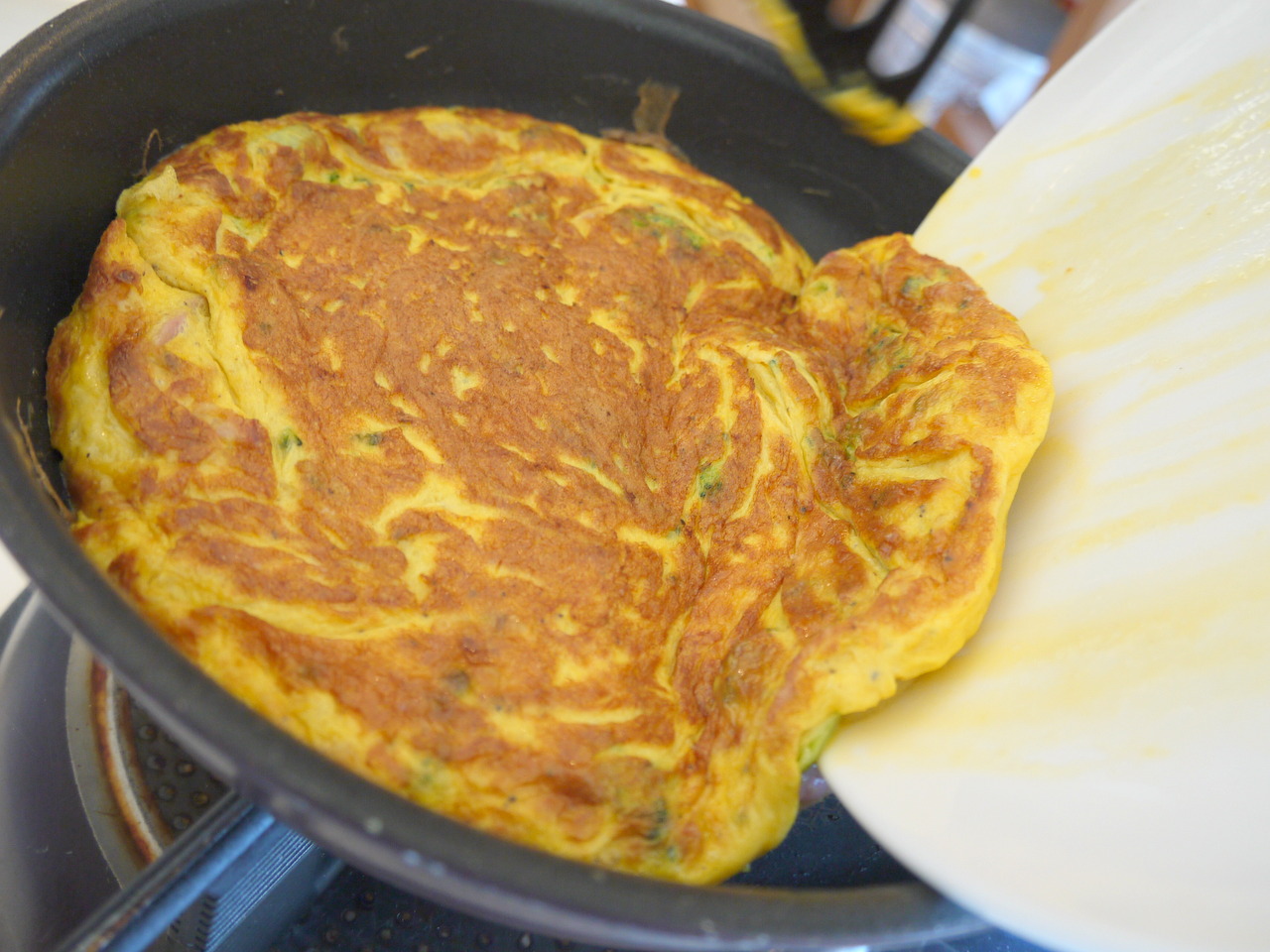 表面の卵液が流れないほどに固まったら、フライパンの上からお皿をかぶせてフライパンをひっくり返してオムレツをお皿に移す。そのままお皿のオムレツをスライドするようにフライパンに戻し、再びフタをして2分前後焼く。パンチェッタはブロックベーコンで代用してもOKです。