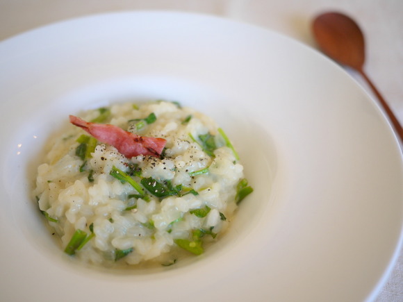 “七草粥”をイメージした洋風おかゆ。七草すべてを揃えなくてもせりとクレソンだけで作れます。お正月の祝膳とお酒でちょっと疲れた胃にもやさしい一品です。
