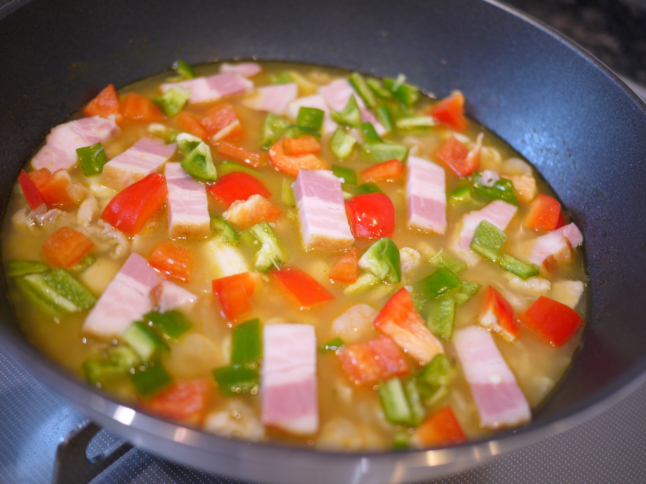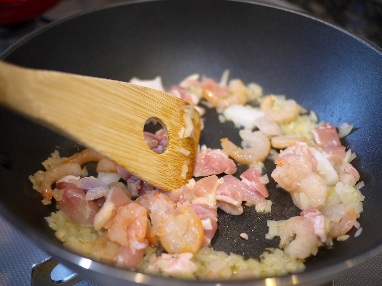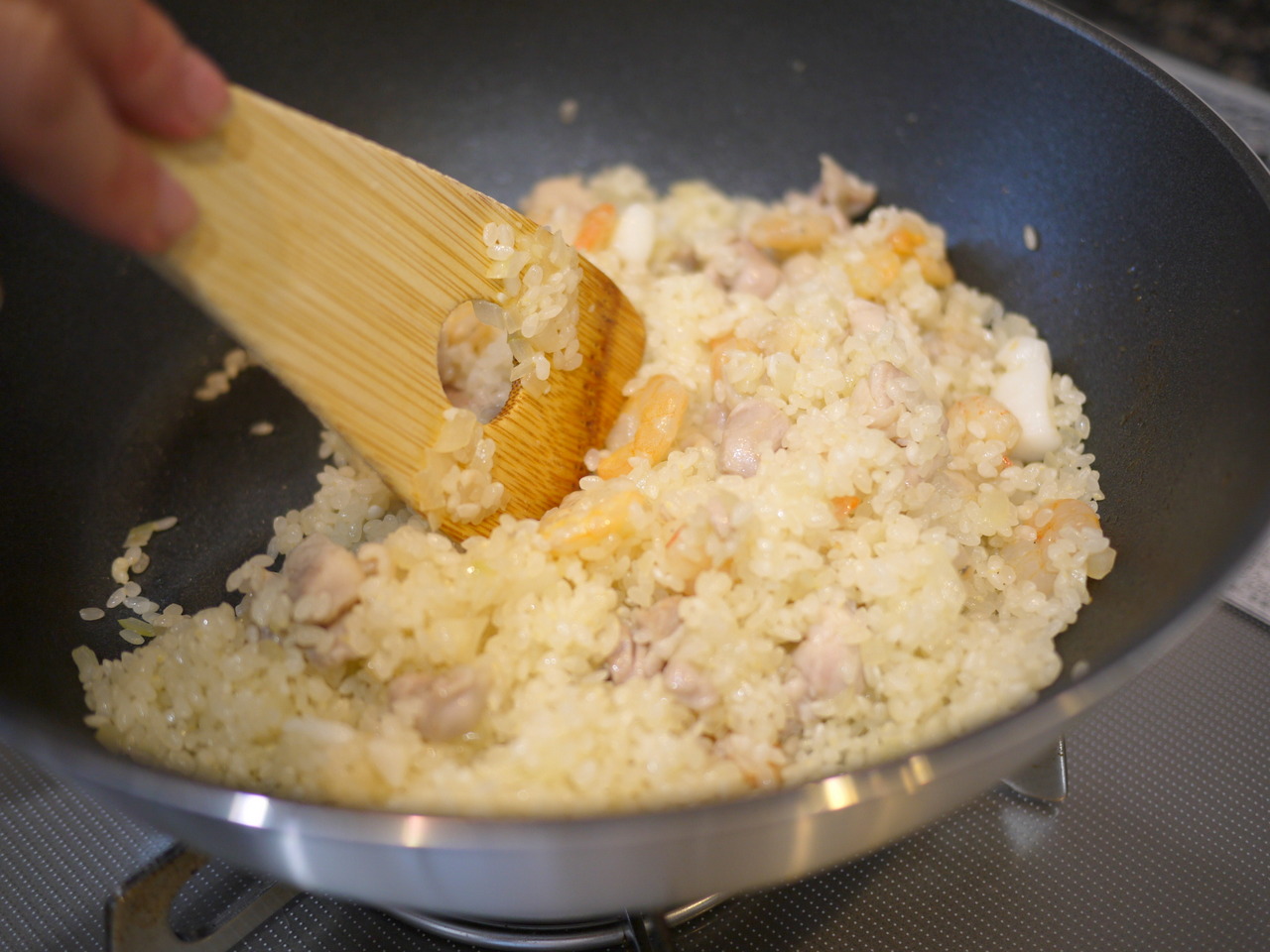 フライパンにオリーブオイルを熱して玉ねぎ、にんにくを炒め、玉ねぎがしんなりしたら、鶏もも肉、シーフードミックスを入れてさらに炒め、鶏肉の色が変わったら白ワインをまわし入れてアルコール分をとばす。