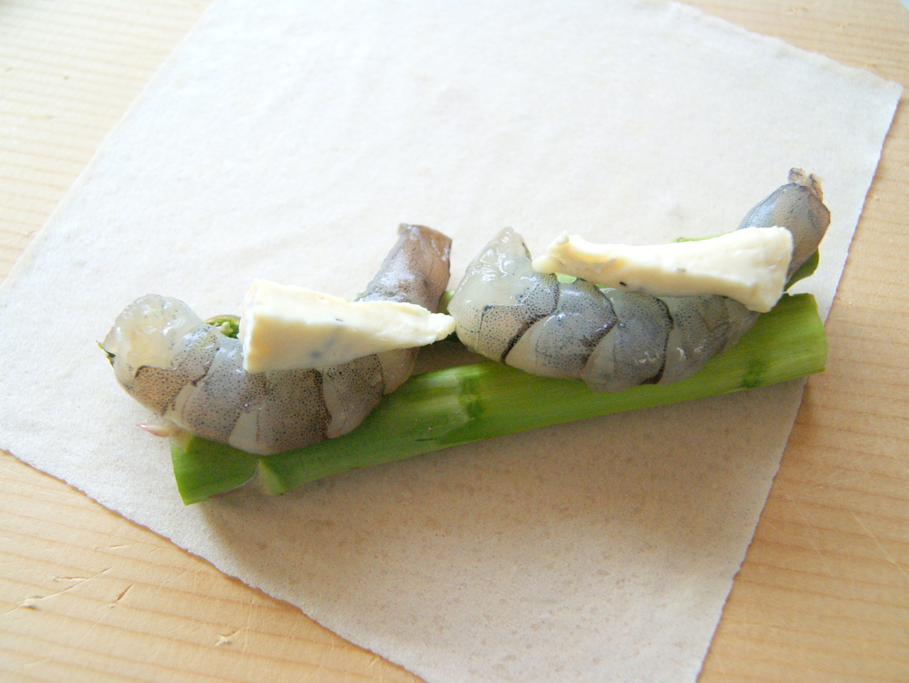 春巻きの皮を広げ、手前側にアスパラガス1本分、えび2尾、ブルーチーズの1/8量、を並べる。端からクルクルと巻き、最後に両端に水溶き小麦粉を塗ってしっかり押さえて閉じる。
