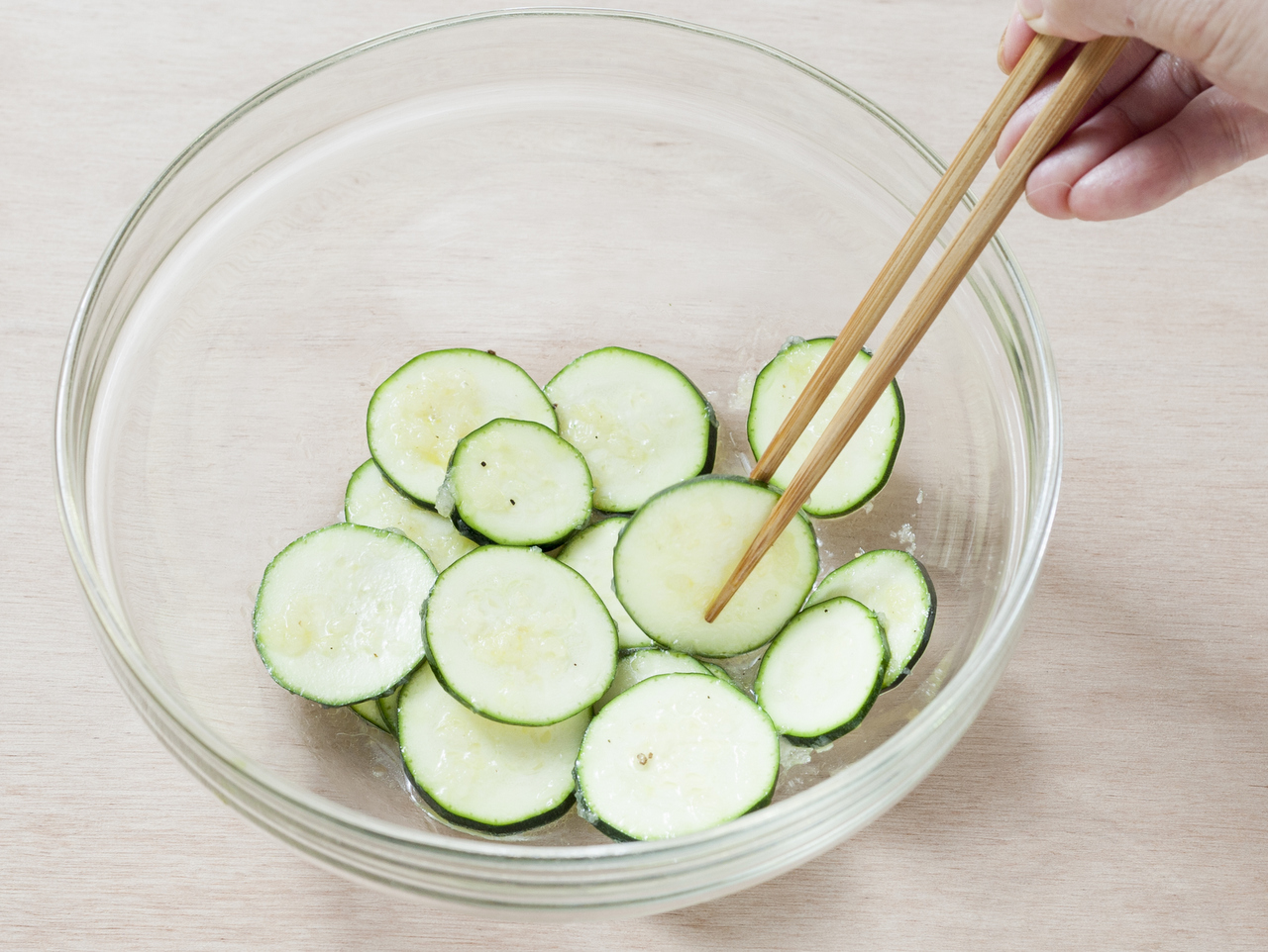 ズッキーニをよく水切りしてから【2】のドレッシングにあえる。 -
