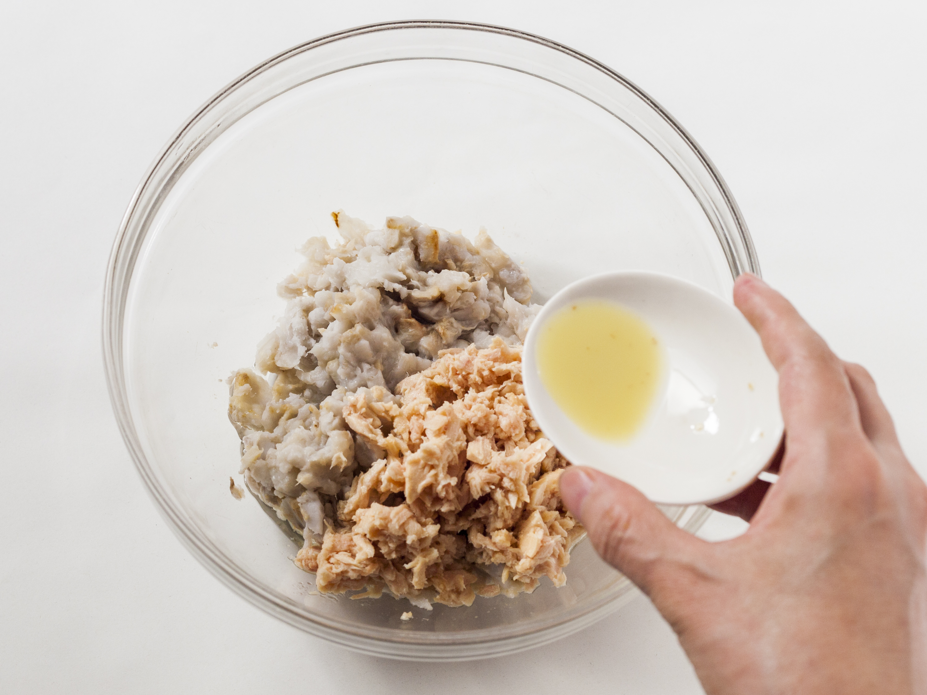 【1】に油を切ったツナ、すりおろしたしょうが汁を入れよく混ぜ、塩、こしょうで味を調える。 -