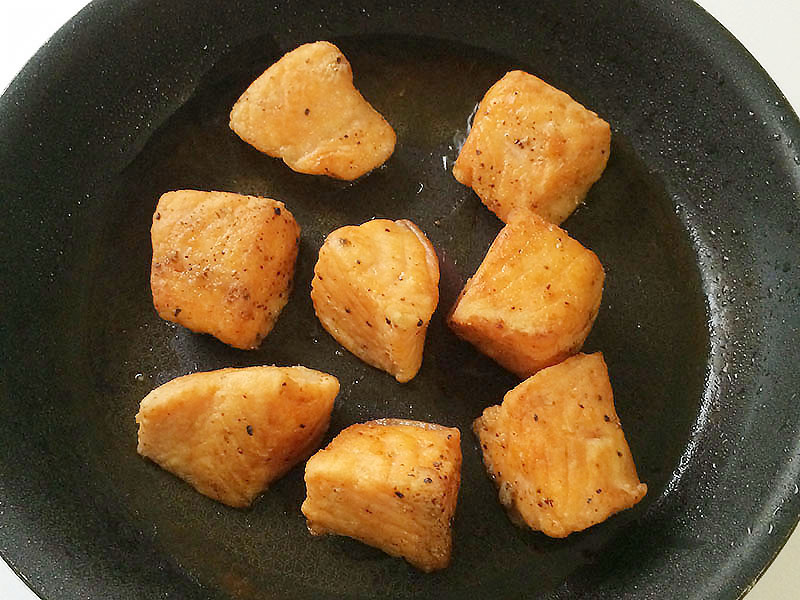 【1】に焼いたサーモンを加えて軽く沈め、粗熱が取れてからラップをして常温で2~3時間、または冷蔵庫に半日程度置き、味をなじませる。器に盛りつけ、お好みでケッパーやディルを飾る。【4】の工程のポイント…にんにくが泡立ってきたらフライパンを傾け、オイルが溜まった部分を火にかけて混ぜながらにんにくを仕上げるときれいに色づきます。