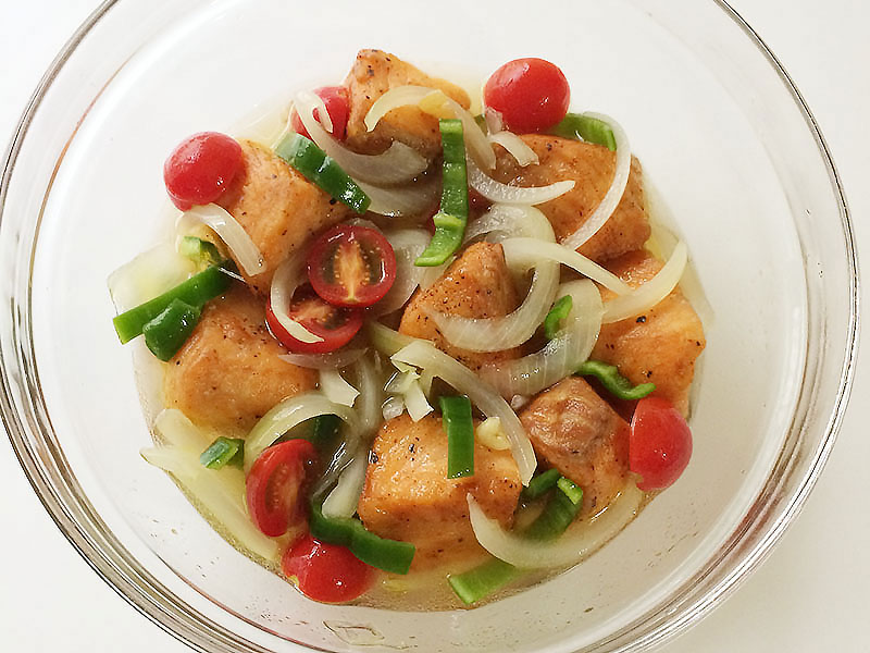エスカベッシュとはスペイン風の南蛮漬け。さっぱりとした酸味が、ジューシーなサーモンの旨味を引き立てます。