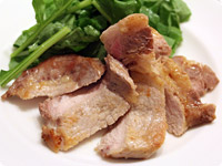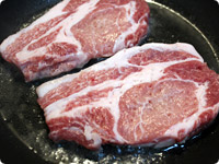 豚ロース肉にフォークで数カ所穴を開け、塩、こしょうを振る。中火に熱したフライパンにサラダ油をひき、片面につき2〜3分程度、こんがりと焼き、火を通す。