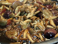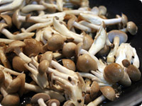 フライパンから豚肉を取り出し、軸を取って小房に分けたしめじを入れて少し炒めたあと、一粒を半分に切ったぶどうを加えてさらに炒める。