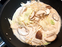 フライパンにBを入れ、沸騰したら根を取ったもやしとざく切りにしたキャベツ、薄切りにしたしいたけを加えて2分ほど煮る。・レタスなど余った野菜をさっと煮込んで加えてもおいしい。