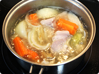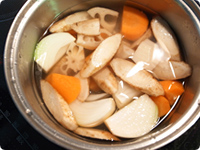 皮をむいて5mm幅に斜め切りしたごぼう、4等分のくし切りにした玉ねぎ、皮をむいて乱切りにしたにんじんとれんこん、皮付きのまま薄切りにしたしょうがと水を鍋に入れて火にかける。