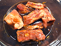 スペアリブ(豚肉の骨付きばら肉)にフォークで数ヶ所穴をあけておく。合わせたAとスペアリブを一緒にボウルに漬け、30分~1時間おく。