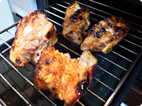 コンロやオーブン、電子レンジなどのグリル機能を使用し、中火で時々裏返しながらスペアリブを15分ほど焼く(トースター1000Wを使用する場合は、アルミホイルを敷いた上に肉を並べ、20~25分ほど焼く)。残ったソースは電子レンジ600Wで5分加熱する。