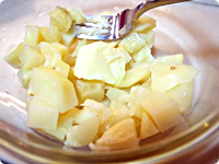 じゃがいもは皮をむいて1cm角に切り、耐熱ボウルにいれてふんわりとラップをし、電子レンジ600Wで6分加熱する。加熱後取り出し、バターを加えてよく混ぜ、塩、黒こしょうで味を整える。・マーマレードのほか、ブルーベリーやりんごなどジャムは何でもOK。