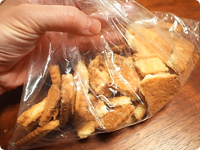 ビスケットをポリ袋やボウルに入れ、細かくなるまで麺棒などで叩く。①で加熱の際に出たシロップを大さじ1加え、よく揉んでタルト生地を作る。・オーガニックでないりんごの場合は皮をむいて使いましょう。