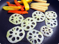 れんこんは3mmの薄い輪切りに、パプリカは1cm幅に縦に切る。中火に熱したフライパンにサラダ油をひき、パプリカ、れんこん、ヤングコーンを並べ、5分ほど焼き、塩を振る。・パプリカの代わりにピーマン、そのほかかぼちゃやなすなど、野菜は好みのものを。