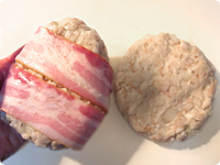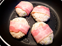 むきえびは1㎝幅に切り、包丁で軽く叩いてねばりを出す。えび、みじん切りにした長ねぎ、しっかりと水気を絞ったツナ、黒こしょうを①に加えてよく混ぜる。4等分にし、厚さが2cmくらいになるよう平たい形に整え、ベーコンを巻く。