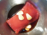 キッチンペーパーなどで鮪の水気をしっかり拭きとる。にんにくを薄切りにして合わせたAに、鮪を半日から一晩漬けておく。