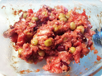 【チリビーンズ】トマトを1㎝角に切り、材料を全て耐熱皿に入れて混ぜ合わせ、ラップをして電子レンジ600Wで5分加熱する。取り出して混ぜ合わせ、ラップをせずに10分加熱する。