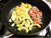 フライパンにごま油を熱し、溶いた卵、食べやすい大きさにスライスしたアボカド、豚肉を入れて強火で炒める。