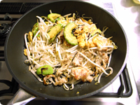 豚肉に火が通ったらそうめん、もやし、塩昆布、こしょうを加えてさらに2〜3分ほど炒める。・豚肉はなしでもOK。麺はうどんで代用することもできます。アボカドがなければ手軽なカット野菜やカットキャベツなどをつかっても。