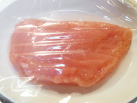 鶏むね肉に塩を振り、深くて大きめの耐熱皿に入れて酒をかけ、ラップをして電子レンジ600Wで5分加熱する。加熱後、粗熱がとれるまで皿にラップを被せておく。