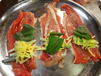 牛肉に塩とこしょうを振り、生ハム、斜め薄切りにしたアスパラ、チーズ、半分にちぎったバジルの順にのせてしっかりと巻く・生ハムは手頃なロースハムで代用してもOK。牛肉は切り落としでも重ね合わせれば巻くことができます。