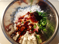 かぶは皮をむいて5mmの角切りに、かぶの葉、ニラ、もやしはそれぞれ5mm幅に切る。ボウルにAを入れてよく混ぜ合わせる。