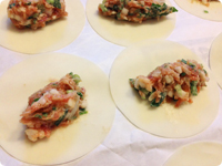 ①を12等分し、ひとつずつ餃子の皮で包む(計12個の餃子を作る)。