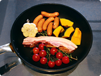 フライパンにオリーブオイルをひき、ブロックベーコン、ソーセージ、かぼちゃ、にんにく、ミニトマトを入れ、上にローズマリーをのせる。塩と黒こしょうを振り、中火で3分ほど焼く。