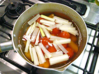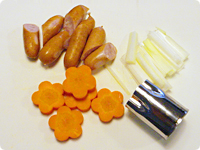 ミニトマトはへたをとり、ソーセージは斜め半分に、長ねぎは5cmの短冊切りにする。にんじんは1cm幅の輪切りにした後、梅の型抜きで型を抜いておく。