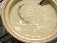 鍋に豆乳、水、白だしを入れて沸騰しない程度に煮立て、ご飯を入れて弱火で約8分煮込む。