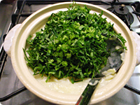 ①のご飯が柔らかくなったら、みじん切りにしたほうれん草と小松菜を入れる。・ちんげん菜や水菜、春菊などそのほかの葉物でもOK。グリーンスムージーのために購入した野菜が余ってしまった時にもぴったりのレシピです。