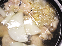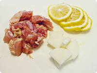 鶏肉は一口大に、ゆずは皮のまま5mm幅の輪切り、大根はいちょう切り、水菜は根元は切り落として3cm幅に切る。しょうがはすりおろしておく。