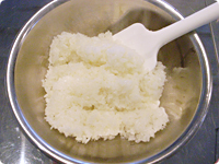 炊きたてのご飯にすし酢をまんべんなく振りかけて混ぜ、酢飯を作る。酢飯は粗熱が取れるまで室温で置いておく(目安10~15分程)。