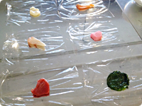 ラップに刺身や漬け物などの具材を並べ、それぞれの上に一口大の酢飯をのせる(具材1つにつき20gが目安)。野沢菜の茎部分は細かく刻み、葉の部分はそのまま使用する。